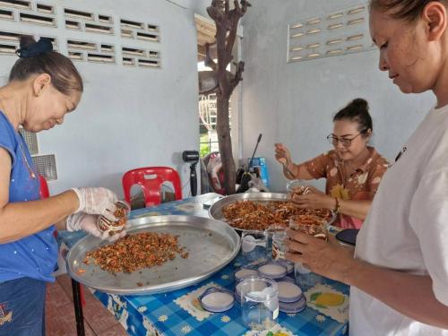 บรรยากาศเป็นไปอย่างคึกคัก สมาชิกกลุ่มต่างร่วมแรงร่วมใจกันจัดเตรียมสินค้าอย่างตั้งใจ เพื่อให้ได้สินค้าที่มีคุณภาพ สะอาด ปลอดภัย และพร้อมให้บริการแก่ประชาชน โดยมีการพัฒนาผลิตภัณฑ์อย่างต่อเนื่อง เพื่อสร้างรายได้และเสริมความเข้มแข็งให้กับชุมชน